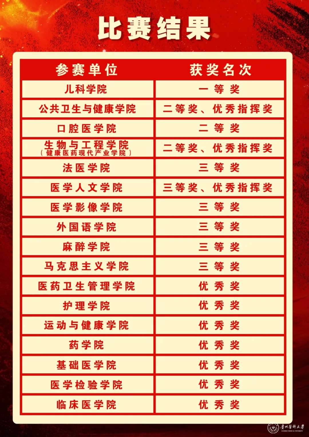 经过四个小时的激烈角逐,儿科学院获得一等奖,公共卫生与健康学院、口腔医学院、生物与工程学院(健康医药现代产业学院)获得二等奖,法医学院、医学人文学院、医学影像学院、外国语学院、麻醉学院、马克思主义学院获得三等奖,医药卫生管理学院、护理学院、运动与健康学院、药学院、基础医学院、医学检验学院、临床医学院获得优秀奖。公共卫生与健康学院、医学人文学院、生物与工程学院(健康医药现代产业学院)获得优秀指挥奖。