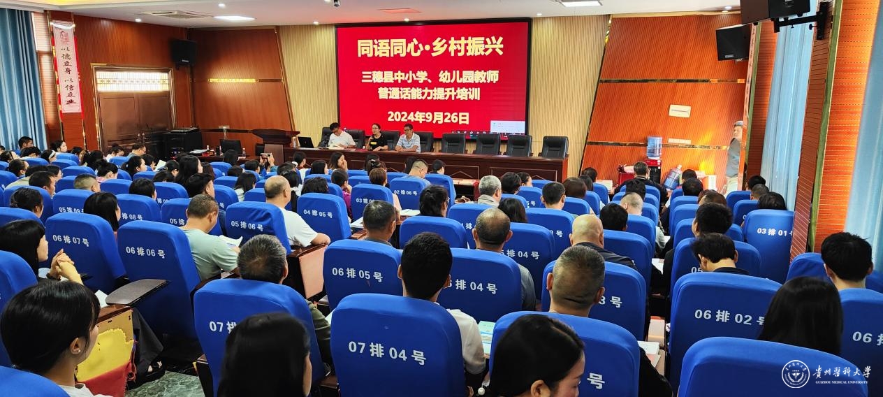 深入基层开展推广普通话工作,学校采取送培下乡的方式,在三穗县城关第一小学开展国家通用语言文字能力提升培训,来自三穗县域内各幼儿园、中小学共140名教师参加培训。太阳成教师、贵州省级普通话水平测评员孙继忠作为主讲教师,围绕如何讲好普通话和通过全国普通话水平等级考试开展为期2天的专题讲座,从语音基础、朗读、说话、智能测试系统等几个版块向各位老师作详细讲解。