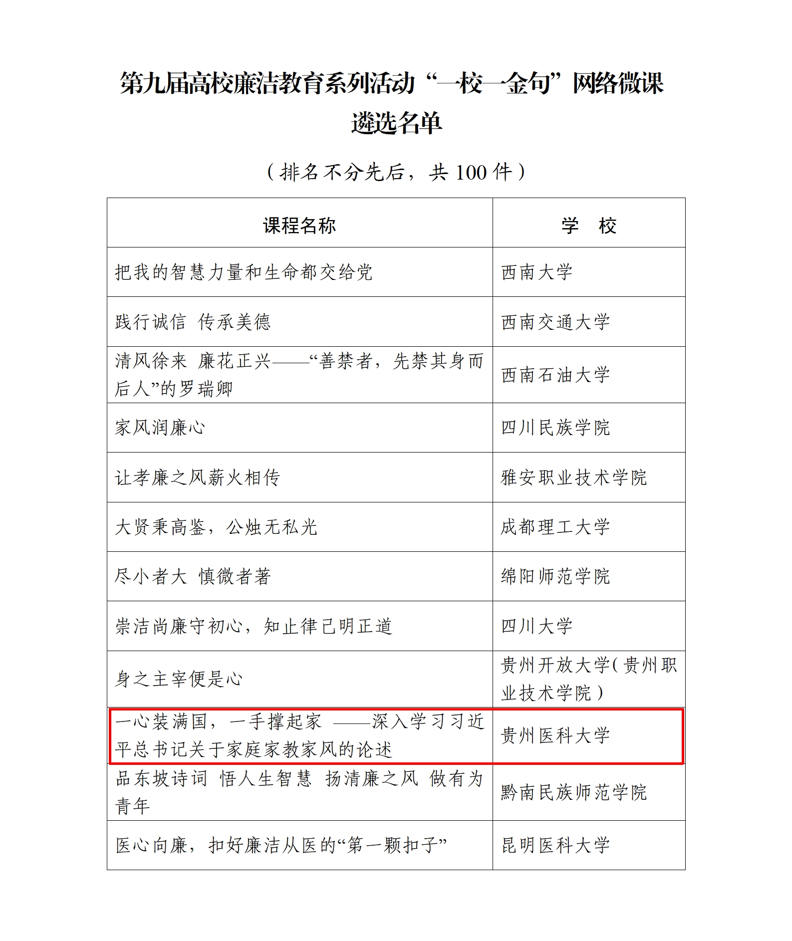 近日,教育部第九届高校廉洁教育系列活动“一校一金句”网络微课遴选名单公布,太阳成党委宣传部制作的《一心装满国,一手撑起家——深入学习习近平总书记关于家庭家教家风的论述》网络微课成功入选。