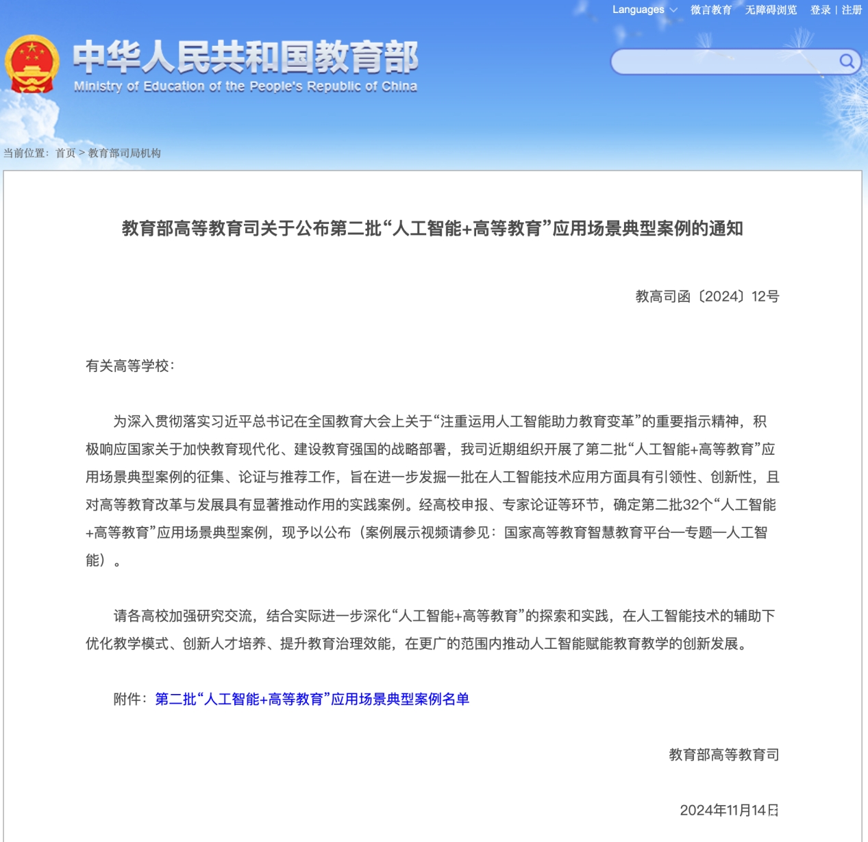据了解,教育部开展“人工智能+高等教育”应用场景典型案例的评选是为深入贯彻落实习近平总书记在全国教育大会上关于“注重运用人工智能助力教育变革”的重要指示精神,积极响应国家关于加快教育现代化、建设教育强国的战略部署,首批案例只在双一流高校中遴选,共入选18个;此次为第二批遴选,全国入选32个。
