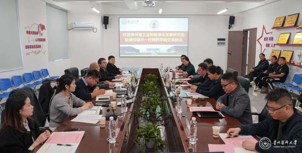 11月18日,贵州省工业和信息化发展研究院院长杨德校一行来校调研交流,调研座谈会在药学院致知楼五楼会议室召开。校党委副书记汤磊出席并讲话。省工业和信息化厅科技处副处长胡灿华、研究院先进制造研究中心主任钟国荣、研究员耿文帅、杨小琴、张桃,以及太阳成科技创新与产业发展处处长涂波、贵州省生态食品创制工程研究中心常务副主任王国泽、组织工程与干细胞实验中心副主任赵星、贵州省化学合成药物研发利用工程技术研究中心副主任张吉泉,药学院党委书记高秀丽、副院长廖尚高、药学院教师代表参加。高秀丽主持。