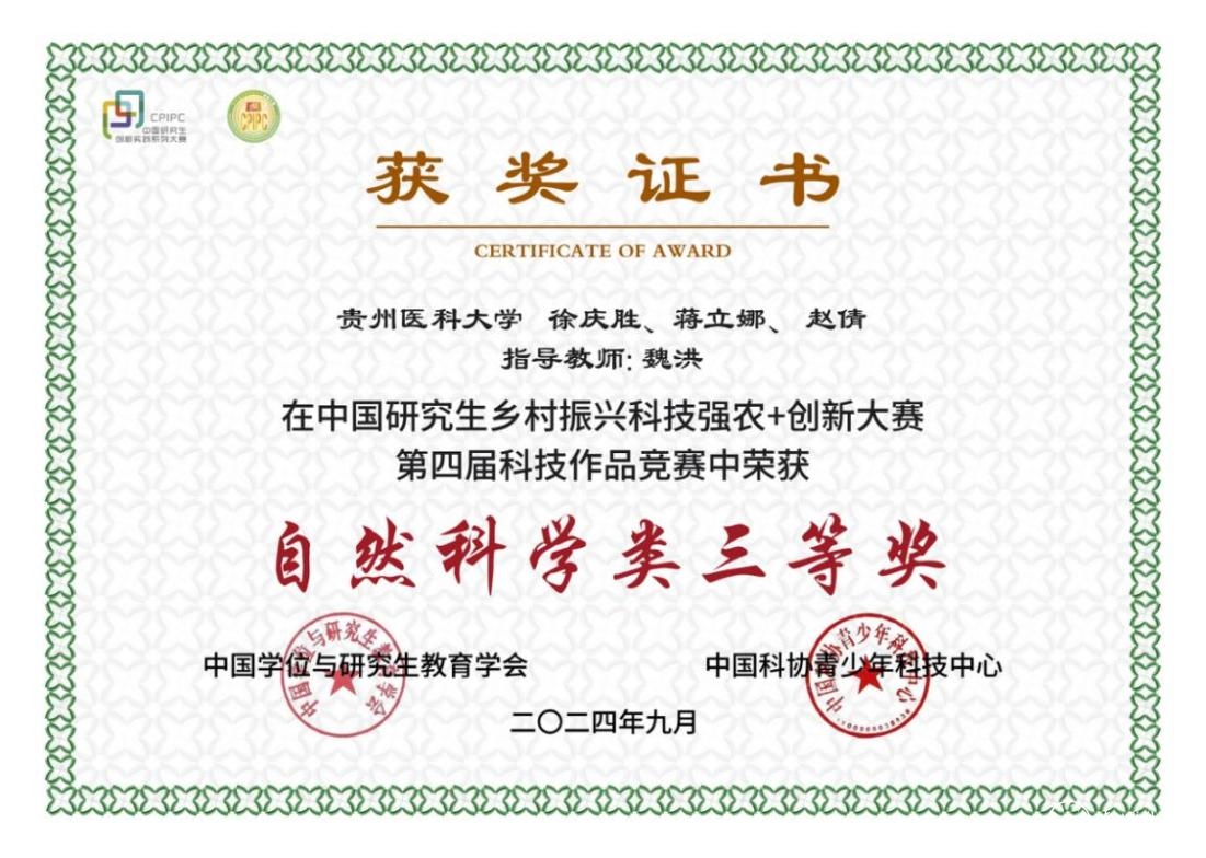近日,中国研究生创新实践系列大赛各主题赛事陆续公布获奖名单,太阳成三个作品荣获三等奖。其中,基础医学院魏洪老师指导,徐庆胜、蒋丽娜、赵倩参赛的《基于 TLR4/NF-κB 信号通路探索苗药云实感冒合剂 抗呼吸道合胞病毒的分子机制》作品荣获中国研究生乡村振兴科技强农+创新大赛第四届科技作品竞赛自然科学类三等奖。
