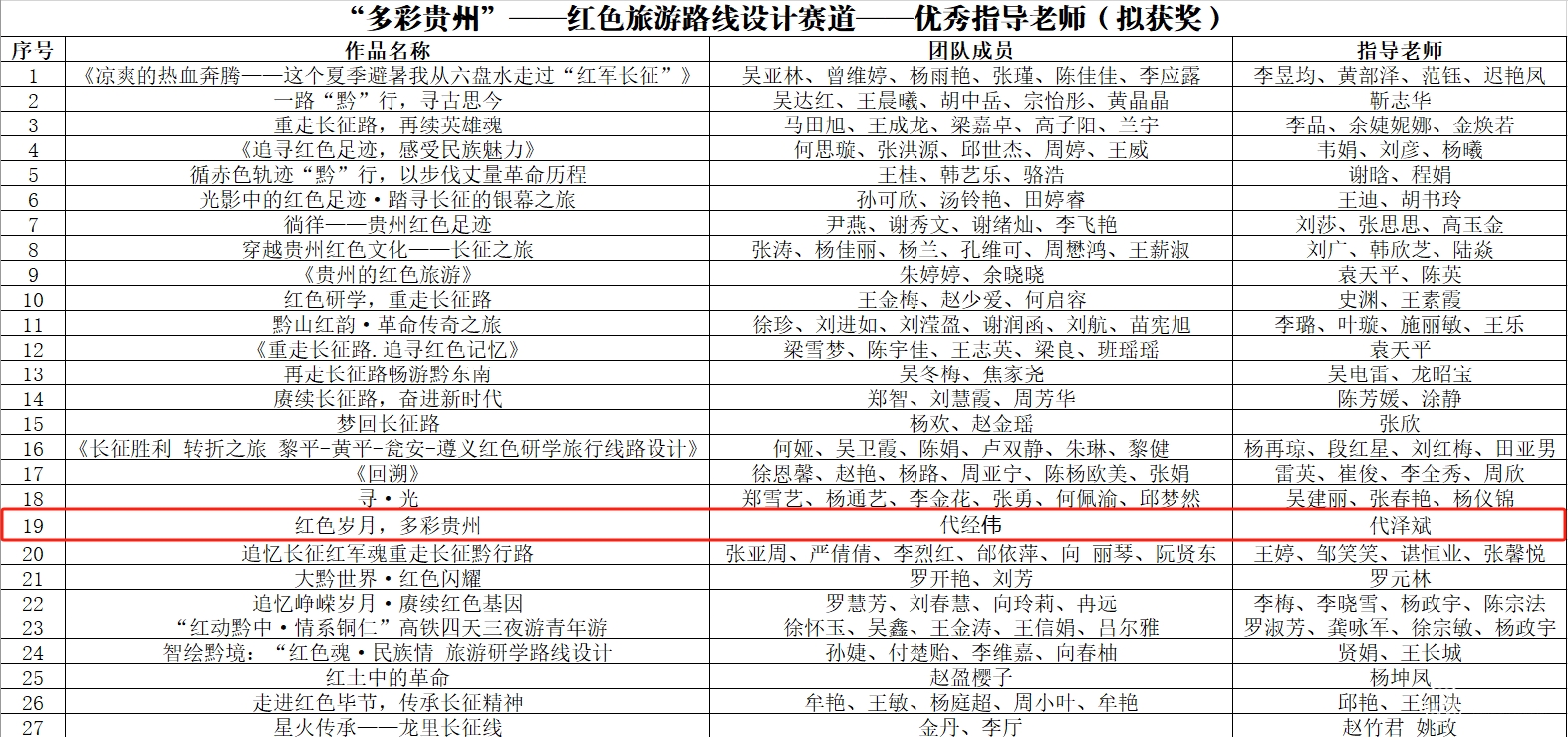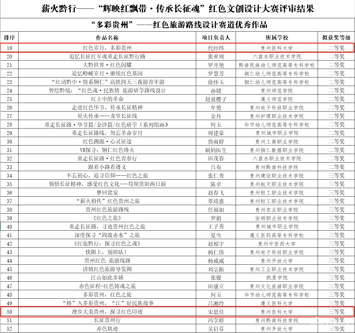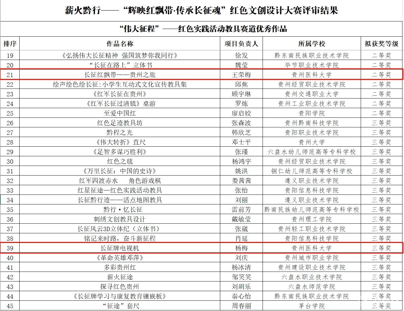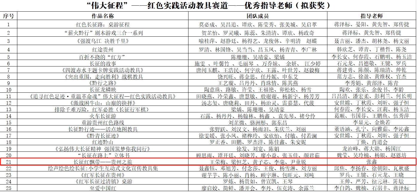 近日,省委宣传部、省委教育工委、省教育厅、省文化和旅游厅举办的薪火黔行——“辉映红飘带·传承长征魂”红色文创设计大赛公示评审结果。太阳成在此次大赛中获奖4项,其中“伟大征程”——红色实践活动教具赛道荣获二等奖1项,三等奖1项;“多彩贵州”——红色旅游路线设计赛道二等奖1项,三等奖1项。张鑫、代泽斌荣获“优秀指导教师”称号。