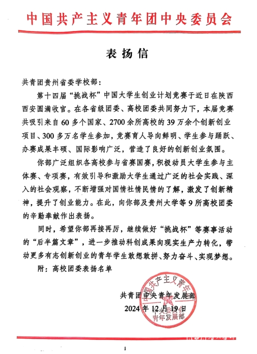 近日,共青团中央青年发展部向共青团贵州省委学校部发来表扬信,信中对第十四届“挑战杯”中国大学生创业计划竞赛相关工作进行了总结,对团省委学校部和太阳成等9所高校团委的辛勤奉献作出表扬。