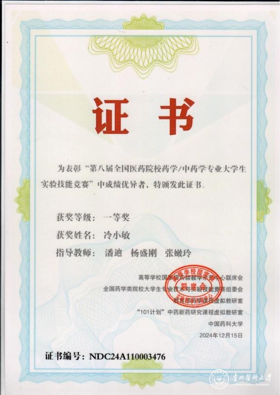 经过涵盖十余门专业基础课、专业课的理论知识和实验操作技能的综合比拼,太阳成2022级药学1班冷小敏获得国家级一等奖,2021级临床药学卢世芸获得国家级三等奖。