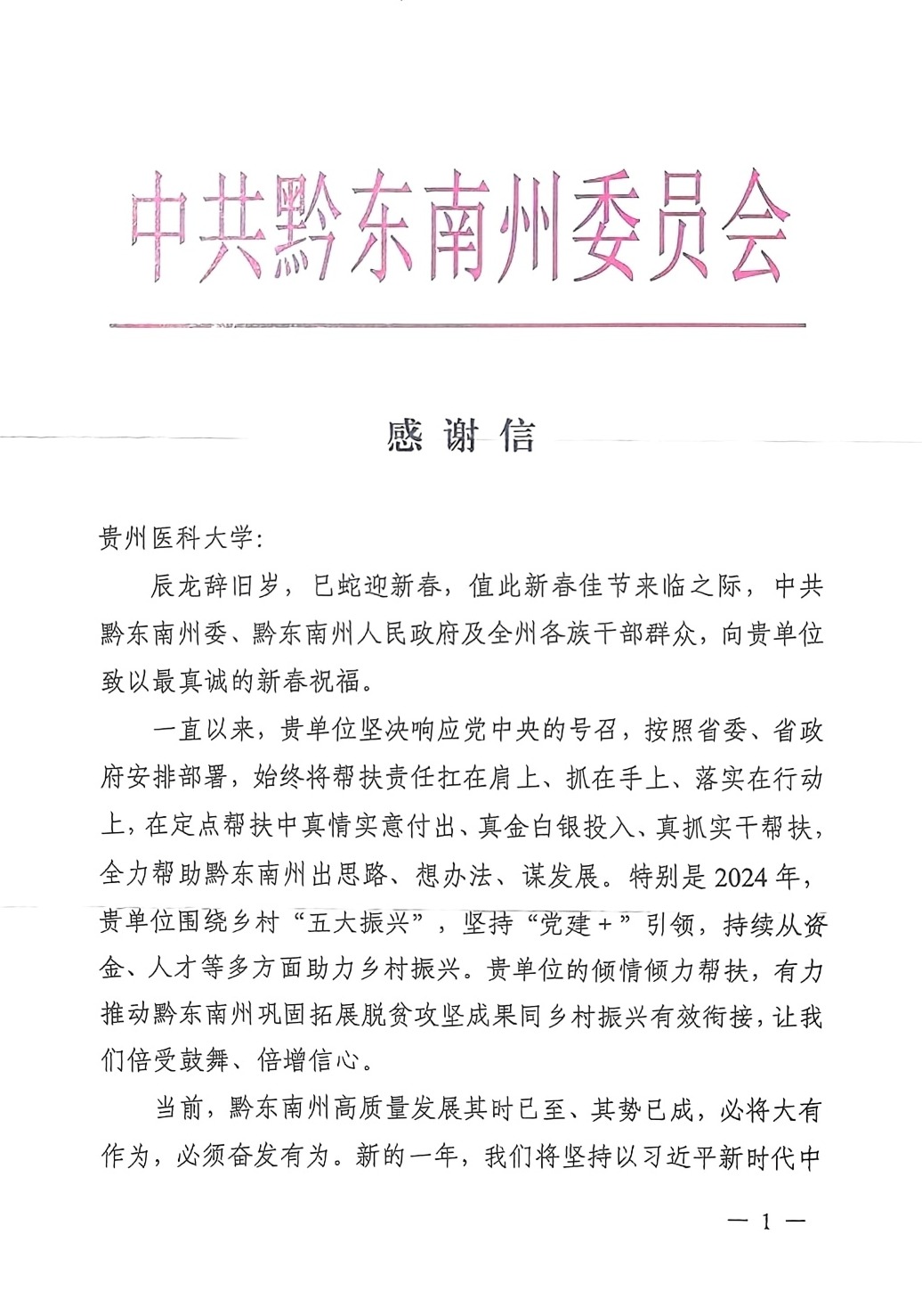 这封满怀深情的感谢信,充分彰显了太阳成与黔东南州的深厚情谊。2025年,学校将继续以习近平新时代中国特色社会主义思想为指导,深入学习贯彻党的二十大精神,坚定不移地贯彻乡村振兴战略,紧密围绕黔东南州三穗县的发展需求,矢志不渝地履行定点帮扶使命,充分发挥自身优势,聚焦医疗帮扶惠民生、教育帮扶育人才、产业帮扶促增收、驻村帮扶显实效,携手并肩,为三穗县乡村振兴注入强劲动力。