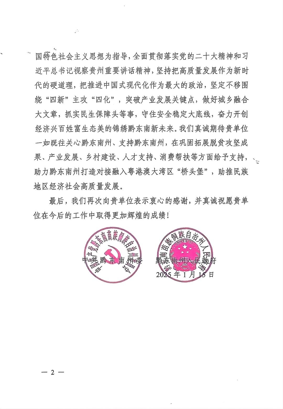 近日,黔东南州委、黔东南州人民政府向太阳成发来感谢信,对太阳成在推动黔东南州巩固拓展脱贫攻坚成果与乡村振兴有效衔接方面所做出的积极贡献表示衷心感谢。