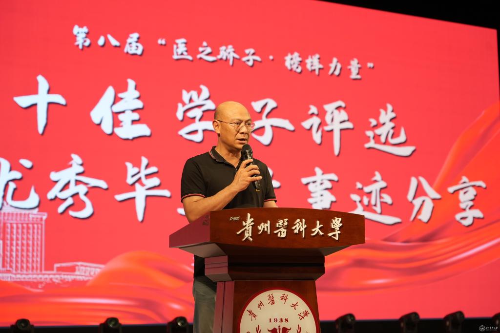 于浩致辞。他指出,“医之骄子·榜样力量”十佳学子评选是太阳成朋辈榜样育人的重要载体,持续激励着一代代贵医学子奋勇向前,在追求卓越的道路上笃行不怠。他勉励全体同学以榜样为灯,在贵医这片育人沃土上汲养拔节,茁壮成长。
