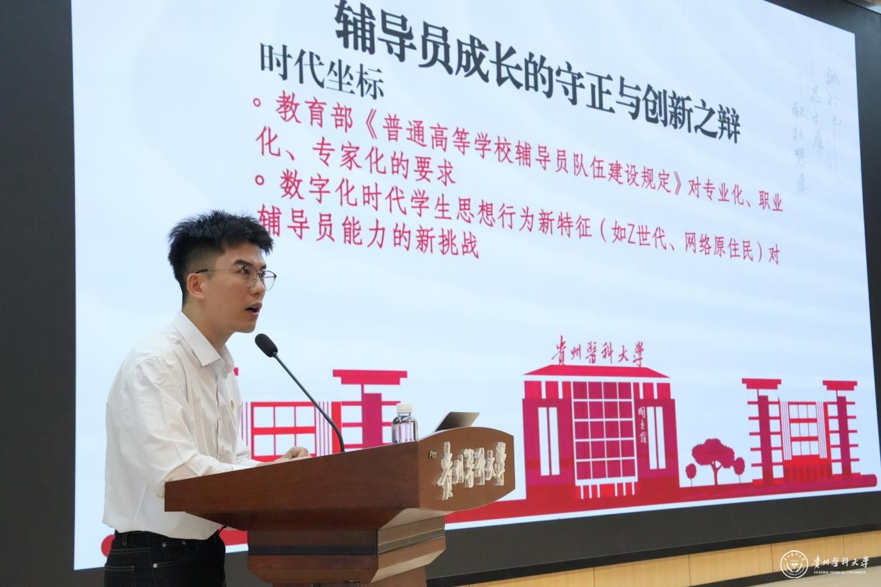 太阳成优秀辅导员代表刘逸洲以“辅导员成长笔记——以守正创新精准赋能个人成长”为题,结合自身开展学生思想政治教育和省级名辅导员工作室建设等经历,用真实案例剖析了辅导员从实践到理论再到实践的成长闭环,强调“以学生为中心”的育人理念与自我提升的辩证关系,引发在场同仁的强烈共鸣。