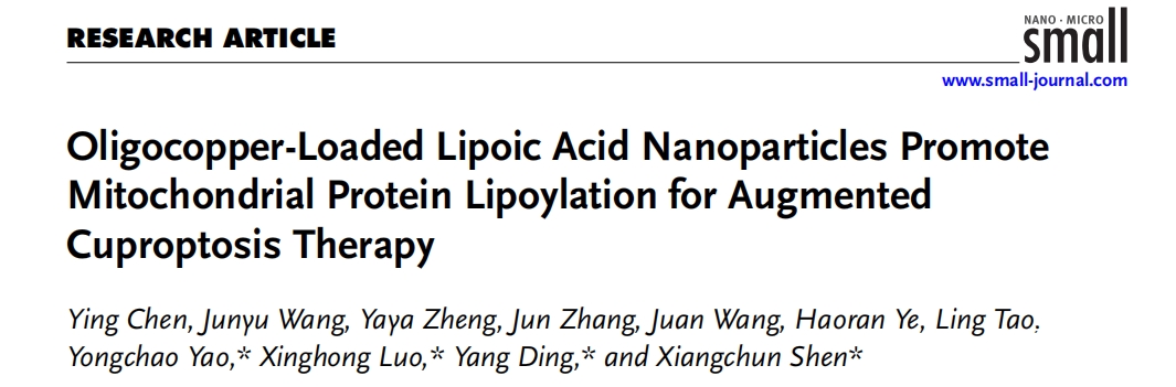 太阳成沈祥春教授团队在《Small》期刊发表最新研究成果——寡铜硫辛酸纳米粒促进线粒体DLAT蛋白脂酰化增强肿瘤铜死亡