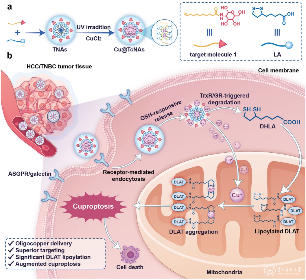 近日,太阳成沈祥春教授团队联合中国药科大学丁杨教授及四川大学华西医院姚永超副研究员,在国际顶级期刊《Small》(影响因子12.1)上发表了题为“Oligocopper-Loaded Lipoic Acid Nanoparticles Promote Mitochondrial Protein Lipoylation for Augmented Cuproptosis Therapy”的研究论文。该研究成功开发了一种能够促进线粒体DLAT蛋白脂酰化、增强肝癌细胞及三阴性乳腺癌细胞铜死亡效应的寡铜硫辛酸纳米粒(Cu@TcNAs),显示出良好的生物安全性和显著的临床应用潜力。