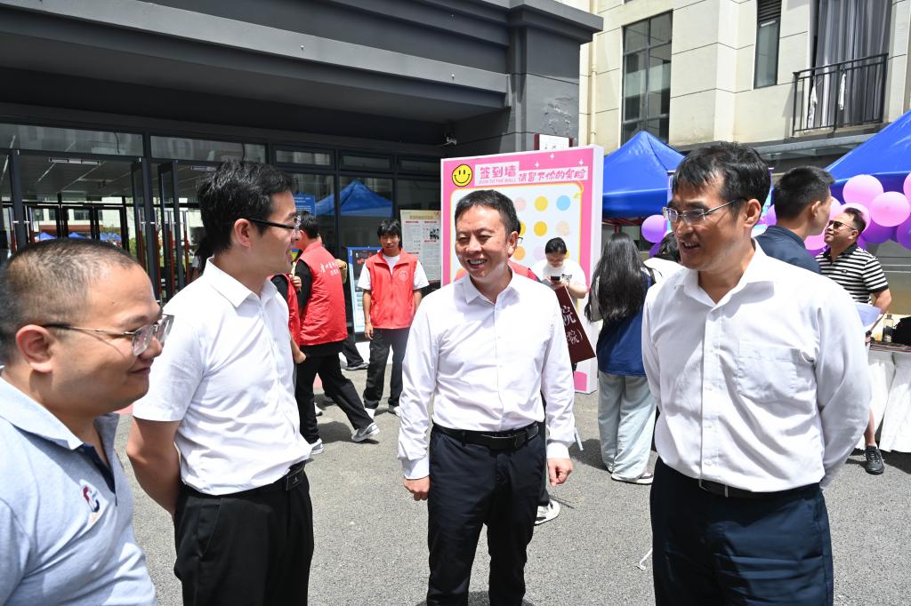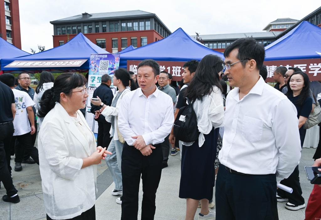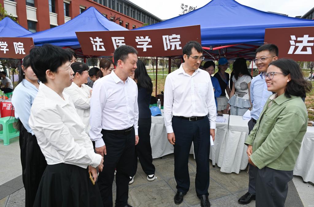 校领导一行到迎新现场,通过查看报到台账、与工作人员交流、和新生互动等方式,详细了解新生报到流程、报到进度,宿舍安排及服务保障工作落实情况。