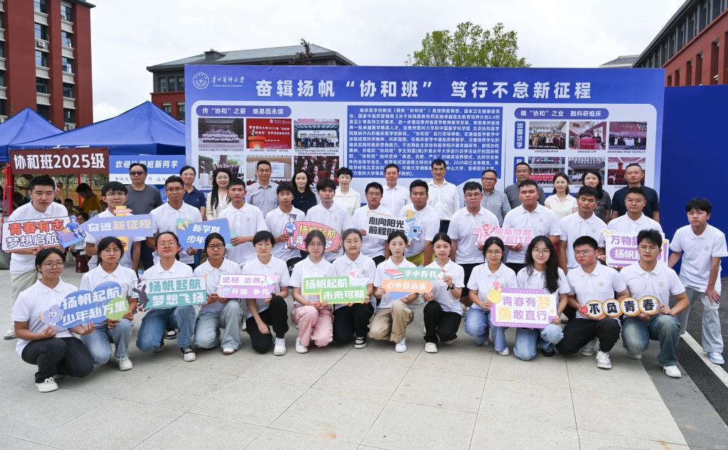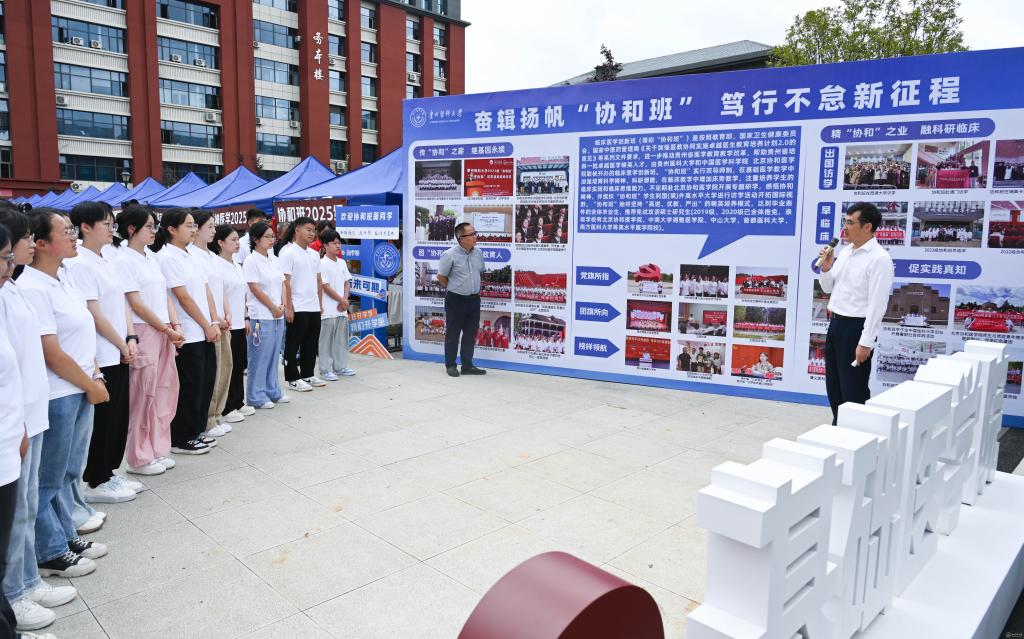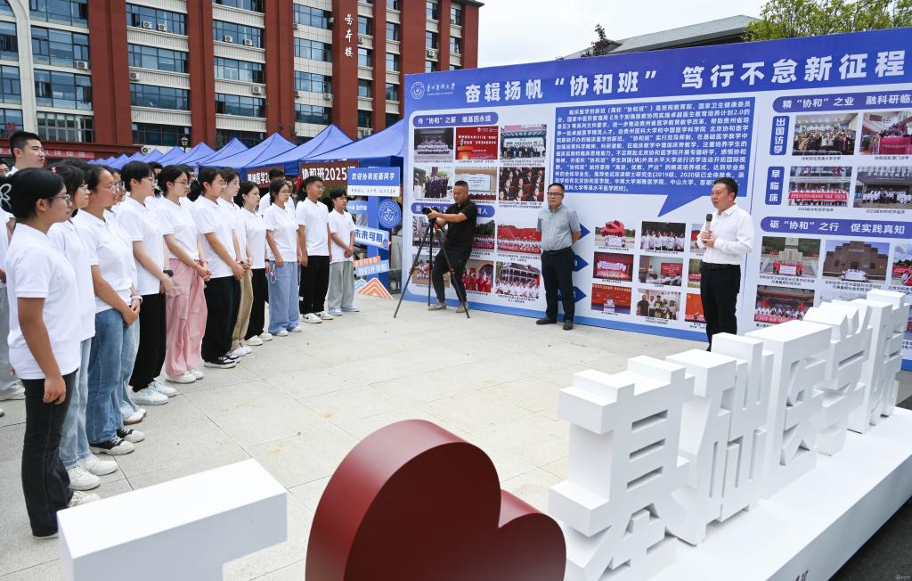 在基础组团,校党委书记汤磊,党委副书记、校长罗鹏和“协和班”学子亲切交谈,并勉励学子们,“协和班”不仅是荣誉的标签,更是责任的传承,希望大家在“诚於己,忠于群,敬往思来”的校训滋养下,锚定医学人生的精神坐标,培养立身之本,精进医术,努力成长,力争为贵州医学事业注入新的青春力量。