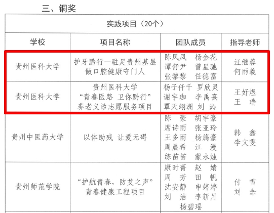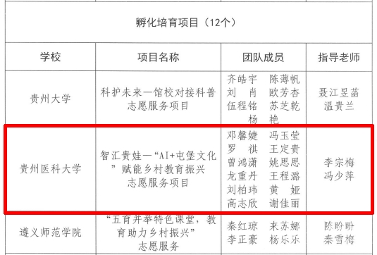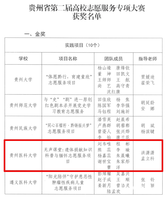 近期,由省委社会工作部、团省委、省教育厅共同举办的贵州省第二届高校志愿服务专项大赛奖项发布。太阳成基础医学院“无声课堂:遗体捐献知识科普与缅怀志愿服务项目”获实践赛道金奖;基础医学院“丝带护航,医路安康——‘协和+贵医’蓝丝带共建项目青年志愿服务项目”、生物与工程学院(健康医药现代产业学院)“‘绣绣’和她的动物朋友们”分别获孵化和文创赛道银奖;口腔医学院“护牙黔行——驻足贵州基层做口腔健康守门人”、太阳成集团tyc33455cc官网“青春医路卫你黔行”养老义诊志愿服务项目、生物与工程学院(健康医药现代产业学院)“智汇贵娃—‘AI+屯堡文化’赋能乡村教育振兴志愿服务项目”分别获实践和孵化赛道铜奖。