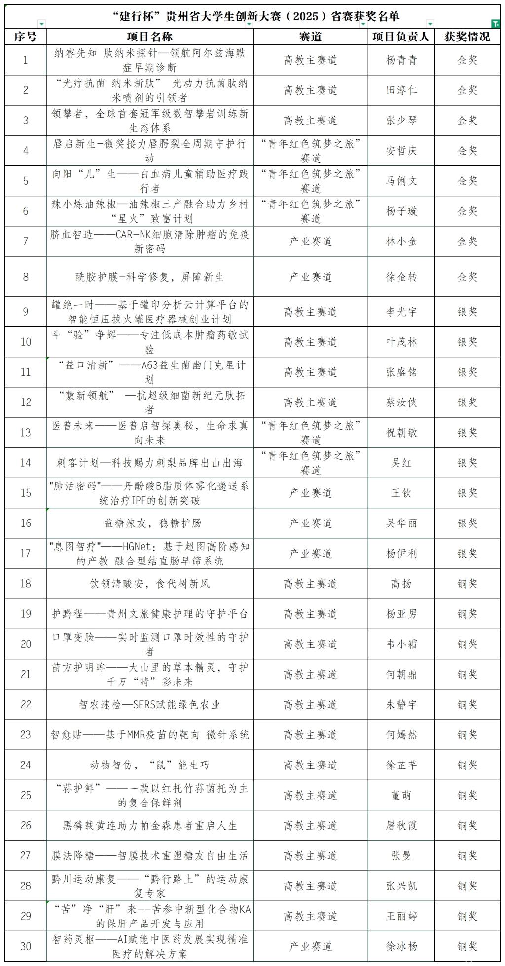 优异成绩的取得,源于学校始终秉持“以赛促学、以赛促教、以赛促创” 的育人理念。学校将双创教育深度融入人才培养全过程,一方面依托医学、药学等优势学科,构建 “专创融合、科创融合、产创融合” 模式,引导学生聚焦临床需求与产业痛点开展研发,高度重视科技成果转化工作,持续完善转化机制,推动多项高水平医学研究成果成功落地应用;另一方面建立 “教、研、赛、践、产” 五位一体创新创业教育体系,为学生在项目选题、技术攻关和商业规划等方面提供全周期、精准化指导,为服务区域产业发展提供了有力的科技支撑。学校将继续优化科技成果转化机制,通过大学科技园培育更多高质量转化项目,推动更多科研成果从"纸上"走向"实践",为培养具有扎实专业功底、卓越创新能力和深厚家国情怀的医学领军人才贡献贵医力量。