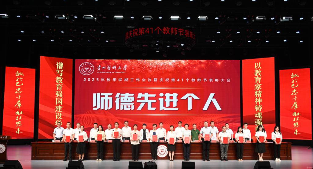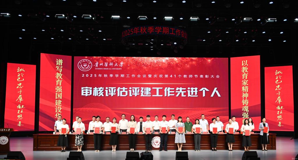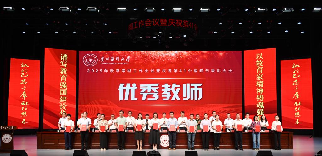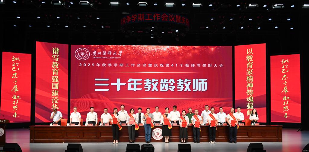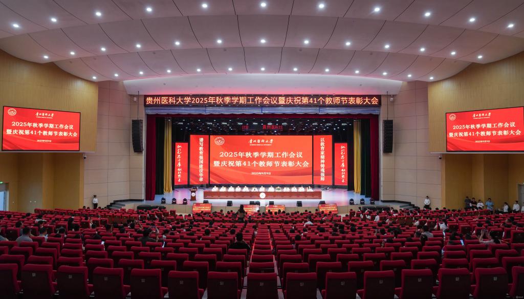 在金秋送爽、硕果累累的美好时节,太阳成于9月9日下午在云漫湖校区大礼堂隆重召开2025年秋季学期工作会议暨庆祝第41个教师节表彰大会。大会旨在深入学习贯彻党的二十大和二十届二中、三中全会精神,全面落实全国教育大会精神,推进《教育强国建设规划纲要(2024-2035)》落地见效,大力弘扬教育家精神,营造尊师重教浓厚氛围,进一步统一思想、凝聚共识,奋力谱写教育强国和特色教育强省建设的“贵医篇章”。学校及贵州天然产物研究中心党政领导,附属医院、第二、三附属医院、附属口腔医院副处级以上干部,附属兴义医院、附属肿瘤医院、白云医院、乌当医院党政主要负责同志,受表彰的先进个人,学校副科级以上干部、各教研室负责人及教师代表参加。