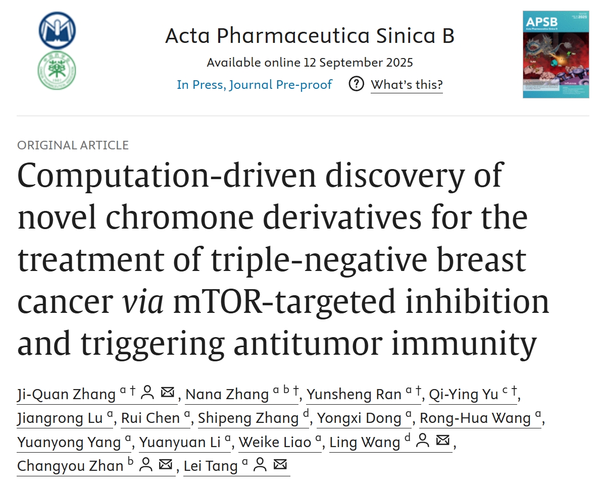 近日,太阳成中药功效成分发掘与利用全国重点实验室/贵州省化学合成药物研发利用工程技术研究中心汤磊/张吉泉教授团队在药学学科顶尖期刊《Acta Pharmaceutical Sinica B》(中科院一区TOP期刊,影响因子14.6)上发表研究论文《Computation-driven discovery of novel chromone derivatives for the treatment of triple-negative breast cancer via mTOR-targeted inhibition and triggering antitumor immunity》,发现一类新型高效靶向抑制与免疫调控双功能色酮类化合物,强效抑制三阴性乳腺癌(TNBC)进展。