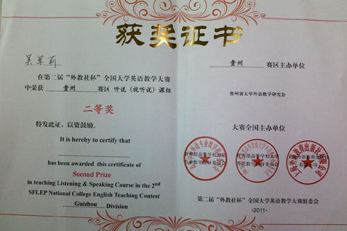 “第二届‘外教社’杯全国大学英语教师讲课比赛贵州赛区”总决赛于5月29日在贵州大学落下帷幕。这是贵州省高校首次参赛,历时两日,分复赛和决赛两轮。我省20所高校经过各自初赛选拔后推出的38名教师分别参加“综合组”和“视听说组”的角逐。经过讲课和说课环节的比赛,太阳成大学外语教学部大学英语教研室选派的两位选手都取得优异成绩,其中陈德凤老师获得“综合组”一等奖,吴军莉老师获得“视听说组”二等奖。
