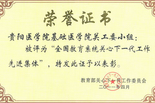 2011年4月,教育部关心下一代工作委员会授予贵阳医学院基础医学院关工委小组“全国教育系统关心下一代工作先进集体”荣誉称号。