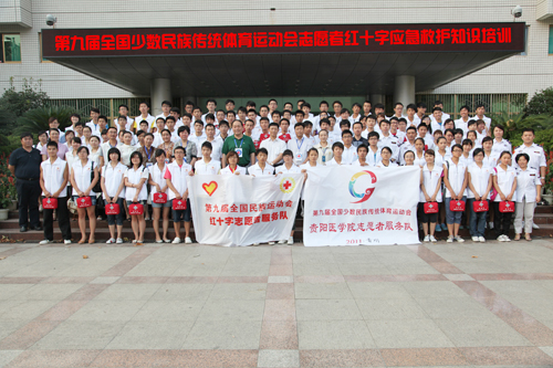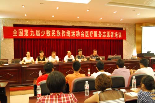此外,太阳成基础二号楼一楼会议室也在8月30日举行了民运会医疗服务志愿者培训,共有247名医疗服务志愿者参加培训。培训会开始前,省纪委驻卫生厅纪检组长、筹委会接待部副部长邵千里作了讲话,他说:第九届民族运动会是新中国成立以来我省第一次承办全国综合性的大型运动会。当好东道主,要把此次运动会举办成一届具有浓郁贵州特色和时代特色的民族运动会。他还对参加此次培训的医疗服务志愿者提出了三点要求:第一、志愿者要做贵州的形象大使,做好宣传大使。第二、志愿者要做友谊大使,让大家感受到贵州人民的热情。第三、作为医疗服务志愿者,更重要的是做好白衣天使。市第一人民医院医务部主任向阳,对医疗服务志愿者同学采取理论与实践相结合的方式进行培训。不仅从志愿者礼仪、现场应急处理方法,心肺复苏,心血管病人的现场救治四个方面进行理论讲解,还带来专业的医疗器材指导志愿者开展各种急救培训。