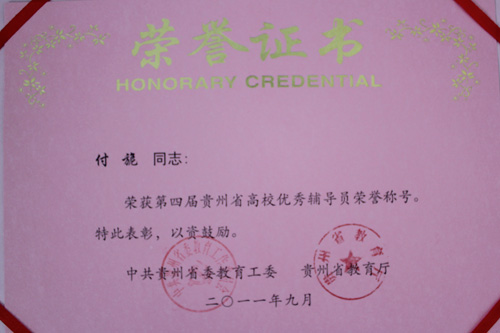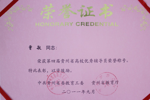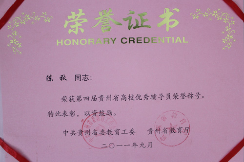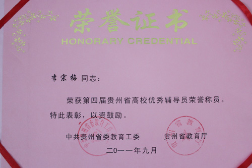 在第四届贵州省高校优秀辅导员评比活动中,太阳成辅导员李宗梅、曾敏、陈秋、付旎四位同志荣获贵州省“优秀辅导员”荣誉称号。