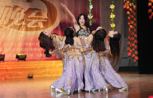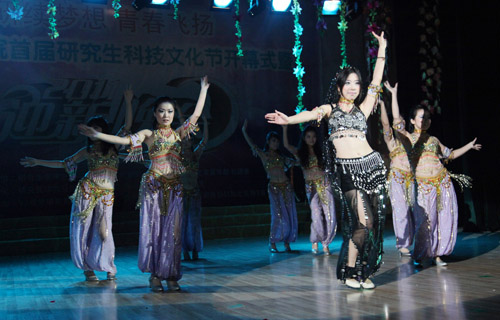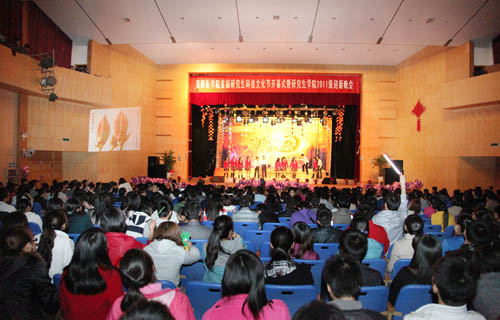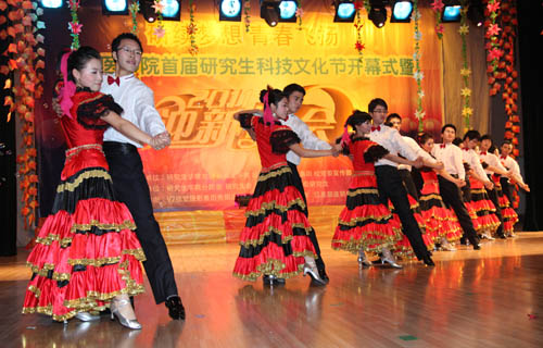 首届研究生科技文化节开幕式结束后,在一段劲爆的《钢管舞》中拉开了2011级研究生迎新晚会的帷幕。歌曲《红月亮》、《迷迭香》、《天路》等脍炙人口,舞蹈《月光下的凤尾竹》、《Buttons》、《Kiss Kiss》、《宫廷华尔兹》等舞姿婀娜,配乐诗朗诵《火种颂》大气磅礴,器乐合奏《彩云追月》美轮美奂,小品《新龙门客栈》幽默风趣……晚会现场高潮迭起,在场全体师生被一个个精彩的节目深深地吸引着。晚会在《相亲相爱一家人》、《同一首歌》动人旋律中结束。