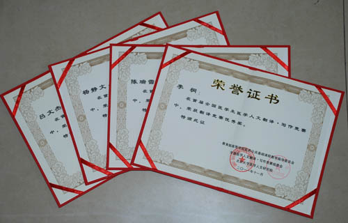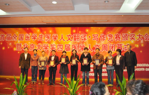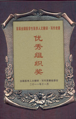 2011年11月10日,首届全国医学生人文翻译•写作竞赛颁奖仪式在北京举行。本次竞赛由教育部高校医药公共基础课程教学指导委员会、中国自然辩证法研究会医学哲学分会、中华医学会医学伦理学分会、健康报社、《英国医学杂志(BMJ)中文版》杂志社、《医学与哲学》杂志社、北京大学医学人文研究院等机构组织联合主办。来自国内25所医学院校近两千名学生提交了参赛作品。太阳成学生在基础医学院副院长曾柱博士的指导下积极参赛,经大赛评委会评审,太阳成学生陈瑞雪、李桐、杨静文、吕文杰4名同学荣获翻译竞赛优秀奖,基础医学院荣获优秀组织奖。