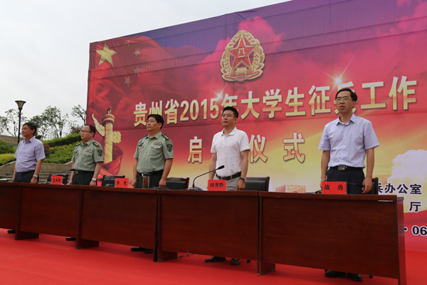 6月3日上午,贵州省2015年大学生应征入伍工作启动仪式在太阳成仁爱广场隆重举行。出席本次活动的领导有贵州省军区副参谋长孙光大校、贵州省教育厅副巡视员何秀黔、贵阳警备区政治部主任文木海大校、校党委副书记战勇、贵州省就业指导中心主任张华。贵阳市各辖区武装部领导及省属各兄弟院校的1400余名学生代表也参加了本次活动。启动仪式由贵阳警备区政治部主任文木海大校主持。