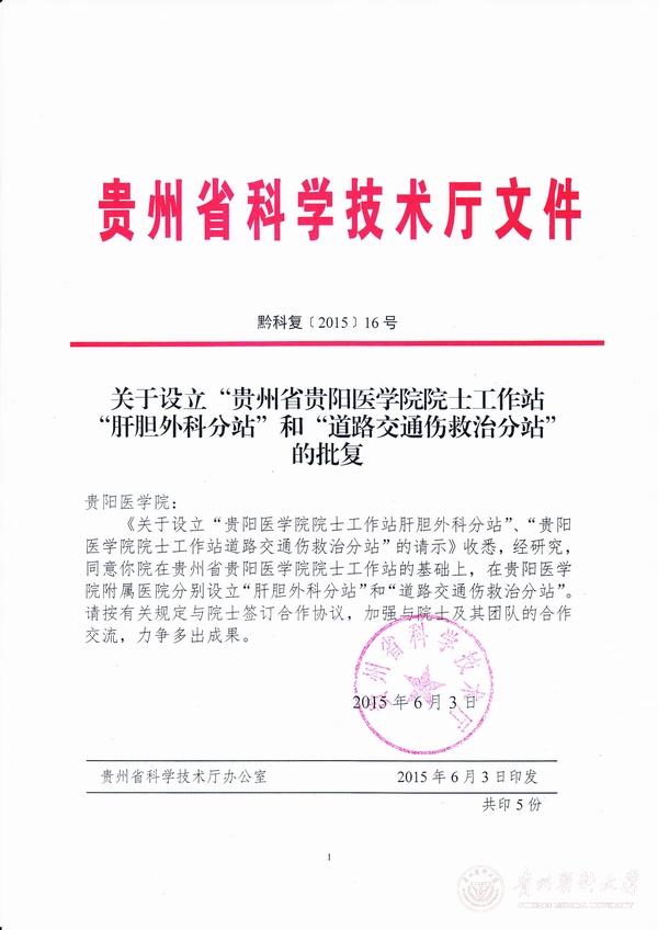经贵州省科学技术厅批准, 2015年6月3日,贵州省贵阳医学院院士工作站“肝胆外科分站”在太阳成集团tyc33455cc官网附属医院正式成立,合作单位是在全国肝胆外科学界享有盛誉的浙江大学附属第一医院肝胆外科的郑树森院士团队,这也是太阳成附属医院成立的首家院士工作站之一。