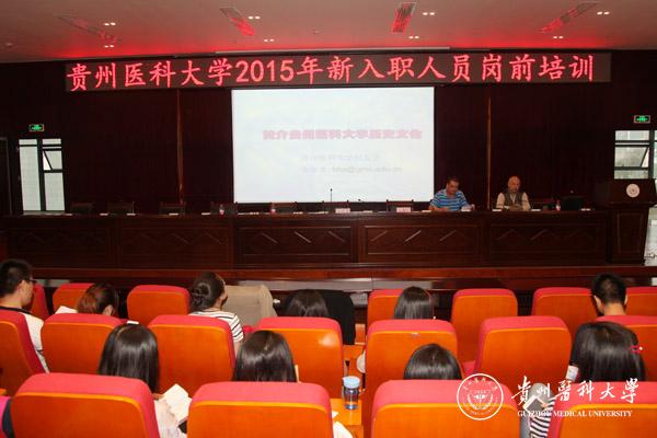 本次岗前培训由两个阶段组成。第一阶段为集中培训,全体新进人员参加,为期四天,培训内容分为三个部分。第一部分主要介绍学校的历史与文化,内容包括学校历史介绍和贵医文化解读,参观校史馆、生命科学馆等;第二部分介绍学校组织与功能,内容包括学校学术研究与学科建设,图书馆资源利用,网络与信息服务、教育信息化建设,本科生教学管理,科研现状、科研平台、科研政策和各类科研基金项目及评奖程序介绍,校园安全保障与建设等;第三部分介绍大学教师发展,内容包括师德师风和职业道德建设,优秀青年教师教学示范与评议,教学课件的设计与制作等。期间,开展有利于增强拼搏意识和团队精神的素质拓展活动;第二阶段为专项培训,新进教师和辅导员参加,时间从9月至12月,分为两个专项培训。一是高校教师资格证培训,内容包括高等教育心理学、高等教育法规概论、高等教育学、高等学校教师职业道德修养;二是辅导员专业技能培训,内容包括《高等学校辅导员职业能力标准(暂行)》,思想政治教育、心理健康教育、职业生涯规划设计、学生事务管理、当前高校学生工作中的难点热点问题研讨等。