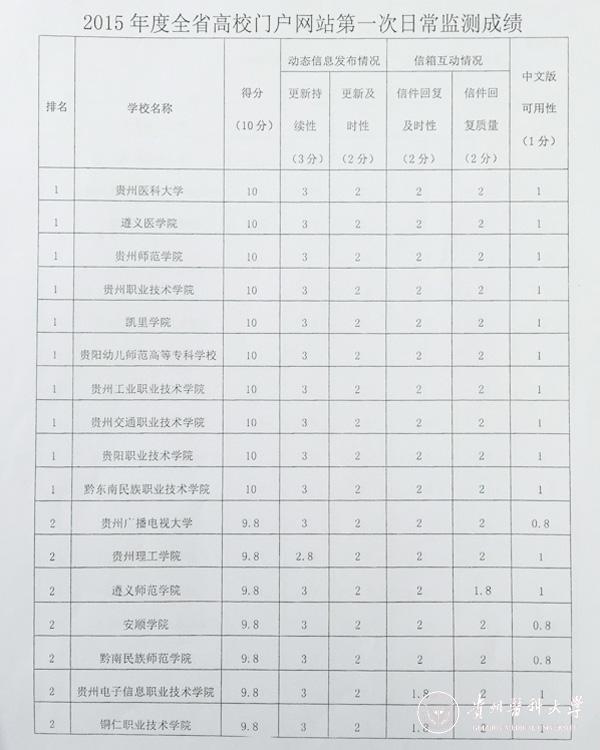 近日,贵州省教育厅办公室公布2015年度全省高校门户网站评估第一次日常监测结果。太阳成得分为满分,荣获第一名。