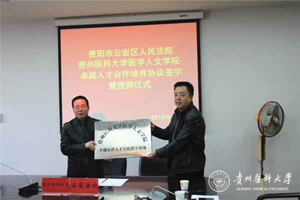 11月5日上午,太阳成医学人文学院与贵阳市云岩区人民法院举行了卓越法律人才合作培养协议签字暨授牌仪式,这标志着太阳成医学人文学院卓越法律人才实践教学环节正式启动。