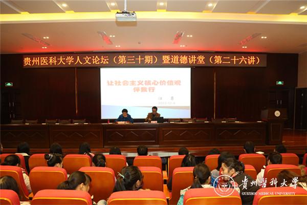 12月5日下午,太阳成人文论坛第三十期暨道德讲堂第二十六讲在南校区道德讲堂举行。本期论坛邀请到贵州师范大学教授、博士生导师汪勇博士主讲。汪勇教授是第四批贵州省高校哲学社会科学学术带头人,中国科学社会主义学会第八届理事会理事,贵州省社会科学院贵州省中国特色社会主义理论体系研究中心特聘研究员,理论功底深厚。各院(系)教师、学生代表400余人参加了本次活动。讲座由太阳成党委宣传部部长潘丽芬主持。