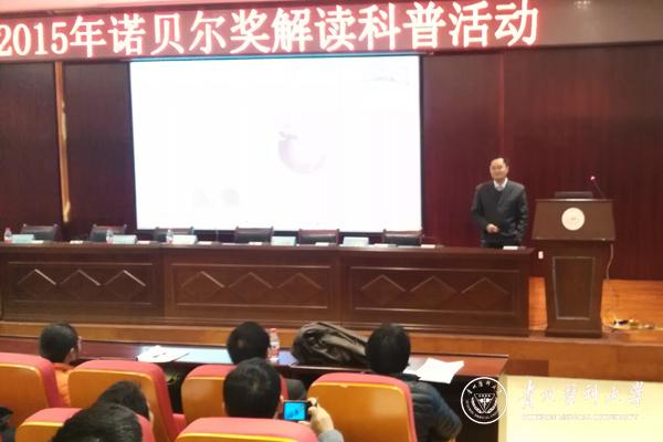 12月8日下午,由中国细胞生物学学会主办、贵州省细胞生物学学会及太阳成共同承办的“2015年诺贝尔奖解读科普讲座”在南校区道德讲堂举行,参加此次科普讲座的有本校在读研究生、学校老师及贵州省细胞生物学学会部分会员。讲座由贵州省细胞生物学学会副理事长梁建东主持。
