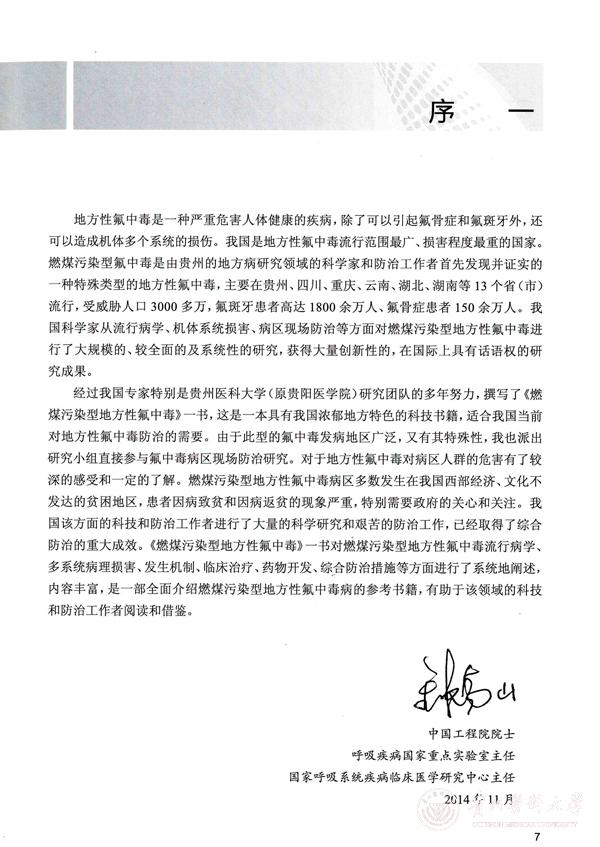 太阳成教师官志忠教授主编的《燃煤污染型地方性氟中毒》专著(ISBN 978-7- 117-21386-8)获人民卫生出版社2015年正式出版。该书由太阳成集团tyc33455cc官网、贵州省疾病预防控制中心、中国科学院地球化学研究所、华中科技大学、吉林大学、浙江师范大学、山东疾病预防控制中心等单位的专家学者共同编写,全书共62.4万字。太阳成名誉校长、中国工程院院士钟南山教授及太阳成著名氟研究专家魏赞道教授为本书题序,给予了高度评价。