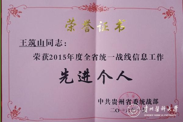2015年,在学校党委的正确领导下,党委统战部紧紧围绕学校中心工作,充分发挥统战独特优势及作用,积极传播学校统战好声音和正能量,统战宣传工作的效果及信息报送的质量进一步提升。在2016年1月召开的全省统战部长会议上,党委统战部荣获宣传工作三等奖,王筑山同志荣获2015年度全省统一战线信息工作先进个人。
