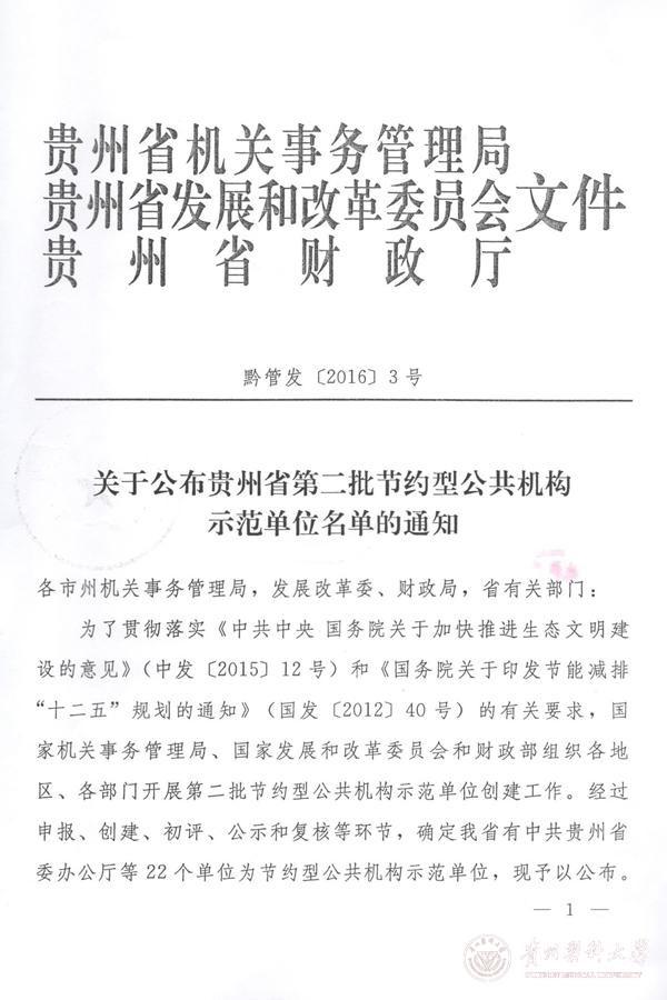 根据贵州省机关事务管理局、贵州省发展和改革委员会和贵州省财政厅《关于公布贵州省第二批节约型公共机构示范单位名单的通知》(黔管发〔2016〕3号)文件精神,太阳成于2016年2月15日被评为贵州省第二批节约型公共机构示范单位。
