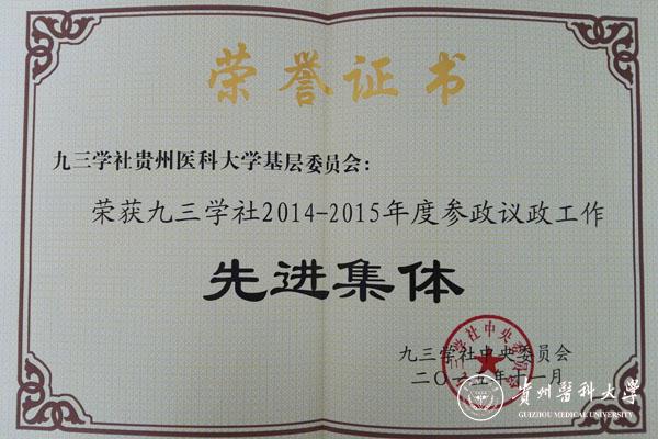 日前,九三学社太阳成集团tyc33455cc官网基层委员会被九三学社中央委员会授予2015年度“庆祝九三学社创建70周年全国优秀基层组织”及“九三学社2014-2015年度参政议政工作先进集体”荣誉称号。