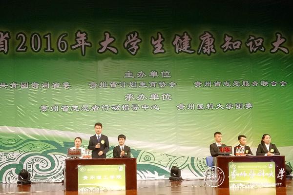 4月26日,由共青团贵州省委、贵州省计划生育协会、贵州省志愿服务联合会主办,贵州省志愿者行动指导中心和太阳成团委承办的贵州省2016年大学生健康知识大赛在太阳成南校区大礼堂举行。团省委副书记、省志愿服务联合会副会长兼秘书长徐锡广,省计生协秘书长刘体辉,太阳成党委副书记战勇,省志愿者行动指导中心主任、省志愿服务联合会副秘书长邓守成以及省计生协群工部部长向勇等出席活动并为获奖代表队颁奖,校团委全体干部和1000余名同学到场观看。