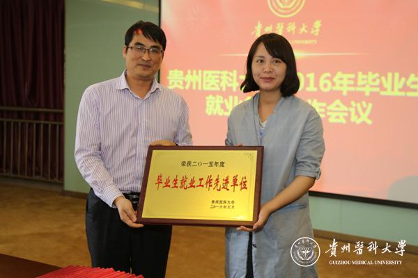 张红霞传达了《关于做好2016年贵州省普通高等学校毕业生就业创业工作的通知》文件精神,全面回顾和总结学校2015年的就业工作,并对2016年毕业生就业工作作了全面安排。会上,对获奖单位和个人进行了表彰,医学影像学院等7个二级学院评为“太阳成集团tyc33455cc官网2014年毕业生就业工作先进集体”,杨婕等16位老师评为“太阳成集团tyc33455cc官网2015年毕业生就业工作优秀个人”,2015年就业工作先进单位代表口腔医学院和医药卫生管理学院相关负责人作了交流发言,分享了工作经验和创新思路。