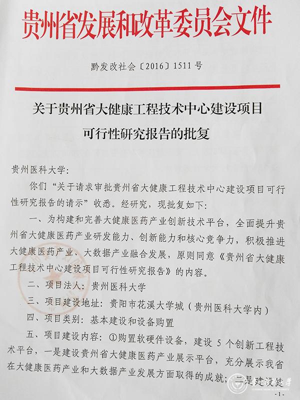 近日,贵州省发展和改革委员会对太阳成大健康学院提交的《“贵州省大健康工程技术中心”建设项目可行性研究报告》进行批复(黔发改社会【2016】1511和黔发改投资【2016】1514),同意该建设方案,拟投资2500万元。该中心将建设贵州省大健康医药产业展示平台,充分展示我省在大健康医药产业和大数据产业发展方面取得的成就。