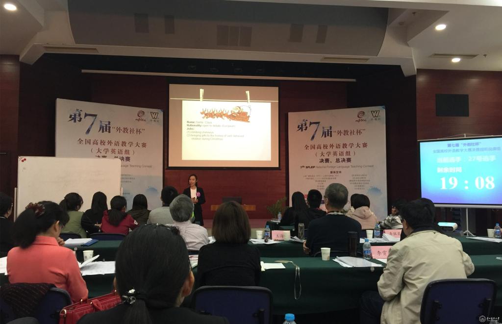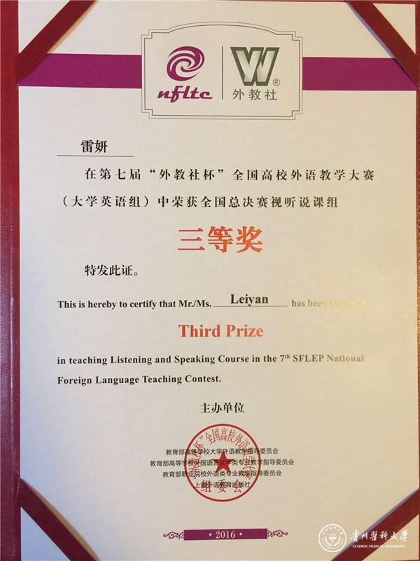 由教育部高等学校大学外语教学指导委员会、教育部高等学校外国语言文学类专业教学指导委员会和教育部职业院校外语类专业教学指导委员会、上海外语教育出版社主办的第七届“外教社杯”全国高校外语教学大赛(大学英语组决赛)于11月6-7日在上海外语教育出版社举行,大赛分为读写组和视听说组。太阳成外国语学院雷妍老师作为6月举行的贵州赛区决赛视听说组特等奖获得者代表贵州参加本次全国决赛的视听说组比赛。29名来自全国的教师参加了本次视听说组的比赛。经过2天激烈的讲课和说课比赛,最终雷妍老师获得视听说组三等奖。 这是太阳成集团tyc33455cc官网英语老师首次站在全国的竞赛舞台上,不仅展示了太阳成英语教师的实力和风采,而且也是一次很好宣传太阳成集团tyc33455cc官网的机会。