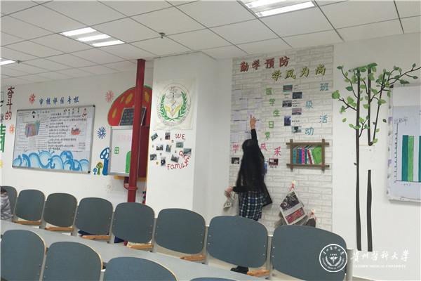 108个教室文化墙内涵丰富、形式新颖、图文并茂、美观大方。各班级立足太阳成校园文化内涵,通过书写贵医赋、励学名言警句、班训等内容,既体现了贵医文化传承,又展示了各学院、班级、专业特色。同时,各班级教室宣传栏内容充分展示了同学们积极参与学校评估认证、有效推进学风建设过程中的做法及亮点,突出反映学习活动成果。