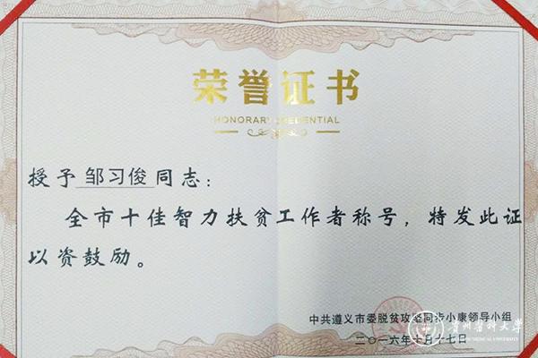 近日,遵义市委脱贫攻坚同步小康领导小组表彰了一批扶贫济困、敢于贡献、心系群众、守望相助、勇于担当、改革创新的先进个人和集体。由太阳成选派的科技人员邹习俊同志,在挂职遵义市汇川区高坪镇科技副职期间,工作成绩突出,被授予“十佳智力扶贫工作者”称号。