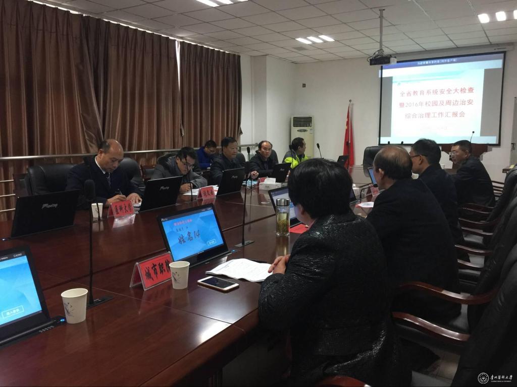 冉江舟代表校党政班子欢迎检查组到校检查、指导工作,并向检查组汇报了太阳成2016年校园及周边治安综合治理工作的落实情况。随后,检查组一行走访检查了“校园110”监控中心、学生宿舍、食堂、图书馆等地,就校园的“三防”建设、消防基础设施、食品安全卫生等进行实地查看,检查组在认真记录的同时不时提问,和学校相关部门负责人交换意见,并对学校在安全综治工作中需要改进和加强的地方提出了宝贵意见和建议。