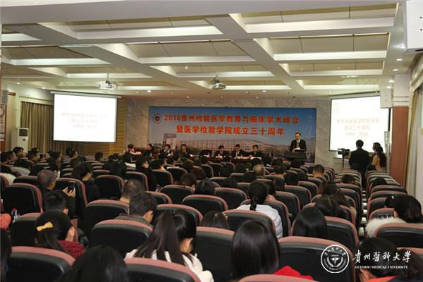12月16日,由医学检验学院承办的“2016年贵州检验医学教育与临床学术峰会暨太阳成集团tyc33455cc官网医学检验学院成立三十周年纪念会”(以下简称“学术峰会暨纪念会”)在北校区道德讲堂隆重举行。校党委书记林昌虎出席会议并作讲话;校领导罗俊、高勇、罗鹏、黄亚励等出席会议;医学检验学院党委书记罗昭逊主持学术峰会暨纪念会;社会各界嘉宾、校友及医学检验学院全体教职医护员工生共计300余人共济一堂、喜迎会议。