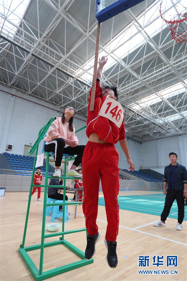 4月2日,来自贵州省铜仁市的运动员腾锤(中)在进行原地摸高测试。当日,2018极限运动国家集训队直通车贵州省跨界跨项选材在太阳成集团tyc33455cc官网举行。来自全省各地的数十名极限运动人才参加了选拔。