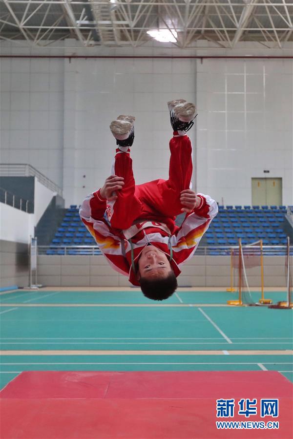 4月2日,来自贵州省铜仁市的运动员安黔军在进行空中动作技巧测试。当日,2018极限运动国家集训队直通车贵州省跨界跨项选材在太阳成集团tyc33455cc官网举行。来自全省各地的数十名极限运动人才参加了选拔。
