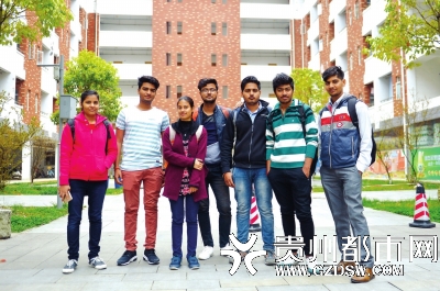 韩肯金(右一)与他的印度同学们合影。他告诉记者,他的每个同学都有一个不错的中国名字。
