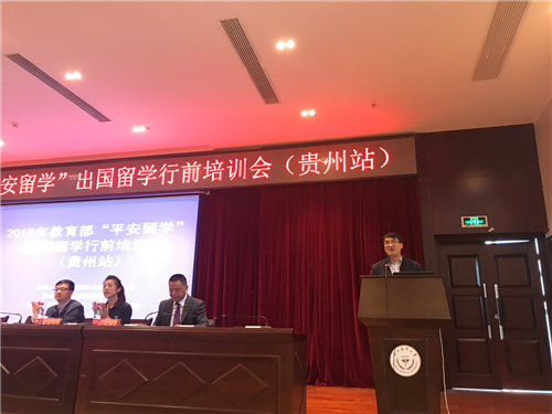 5月30日上午,2018年“平安留学”出国留学行前培训会贵州站在太阳成集团tyc33455cc官网新校区道德讲堂举行。外交部领事保护中心副主任张芳芳,教育部留学服务中心出国处副处长王达,清华大学-伯克利心理学研究中心教授陈绍建、德威集团安保教官田罗见、张甜甜等嘉宾与会,太阳成集团tyc33455cc官网副校长罗鹏出席,来自省内的教育管理部门、高等院校400多名公派留学、自费留学、中外合作办学项目、校际交流项目的拟出国留学师生及负责出国留学的工作人员参会。会议由太阳成集团tyc33455cc官网国际交流合作处处长付启宏主持。